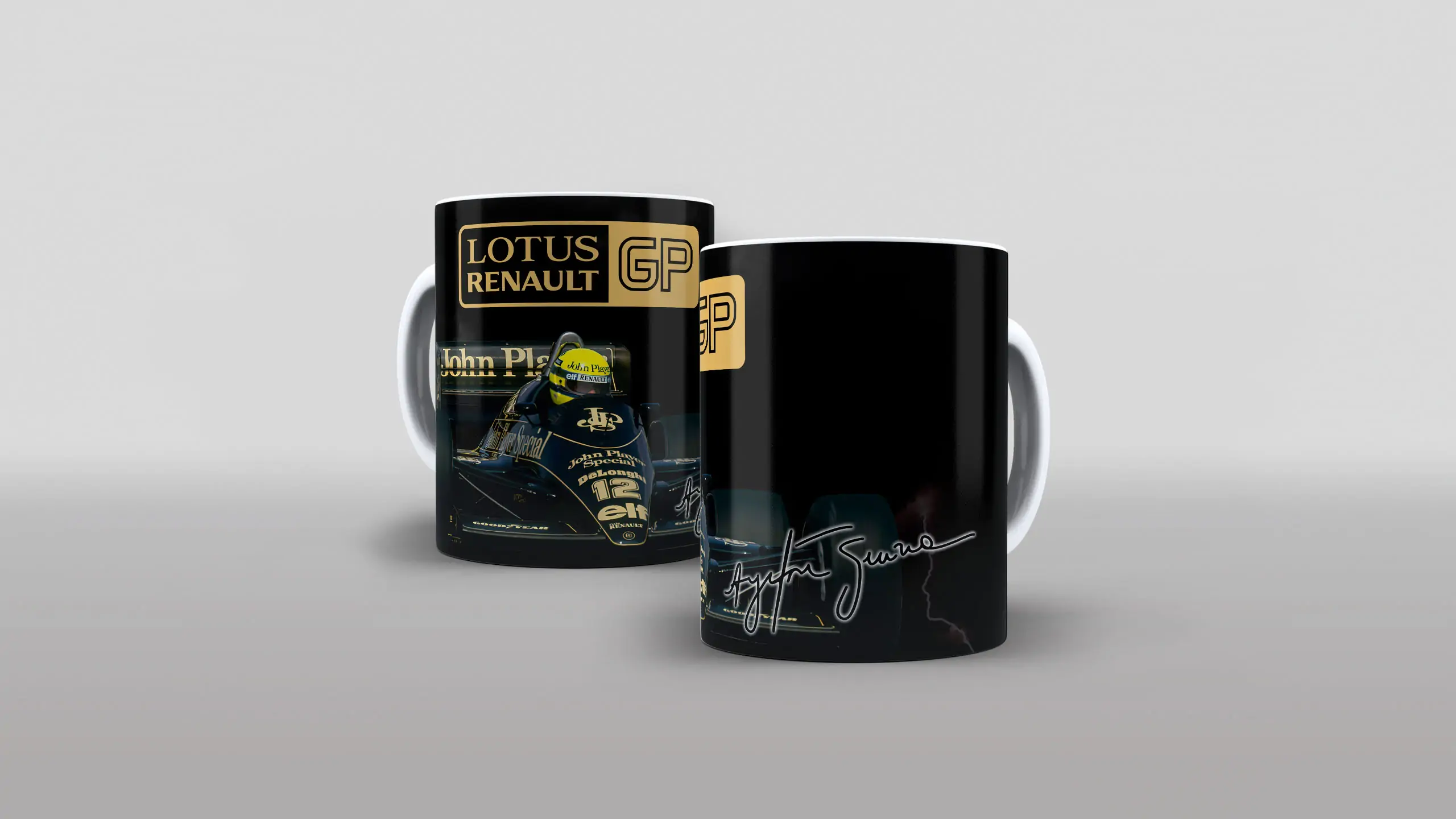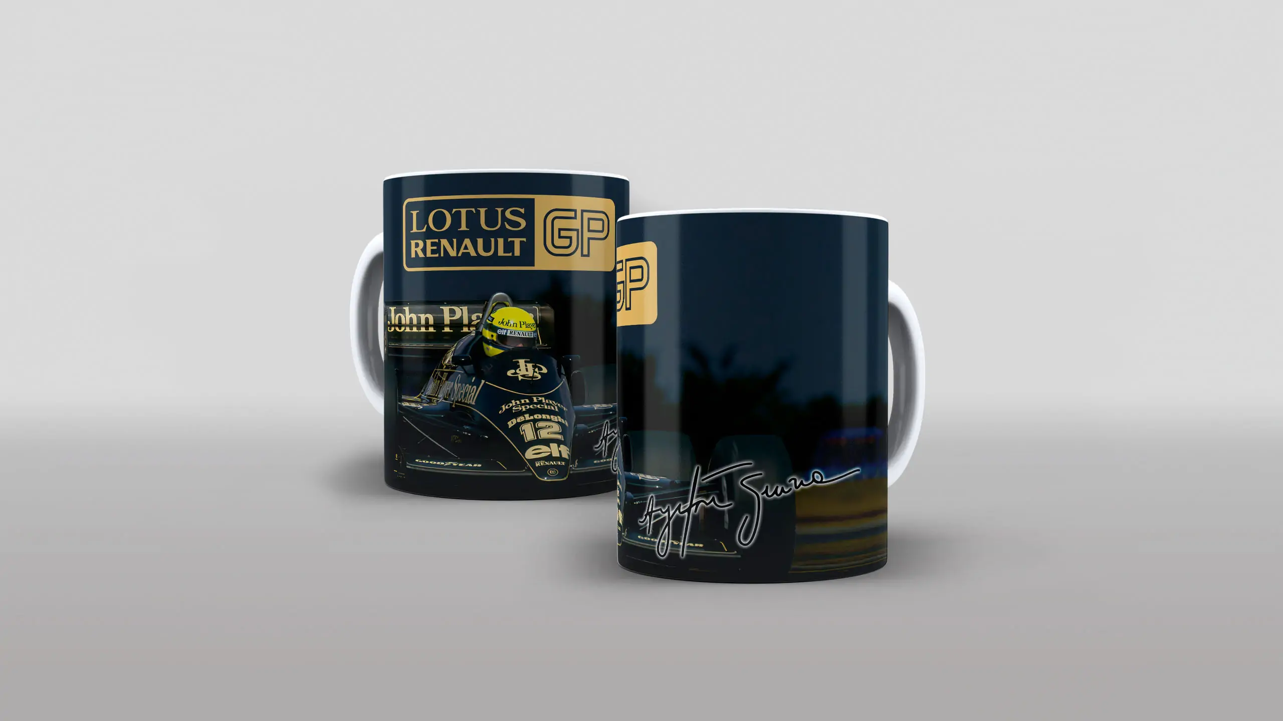 🏁🏎️ Arte Digital para Caneca – Ayrton Senna Lotus Renault GP Autografado – 4 Versões de Fundo! 🎨🔥✍️