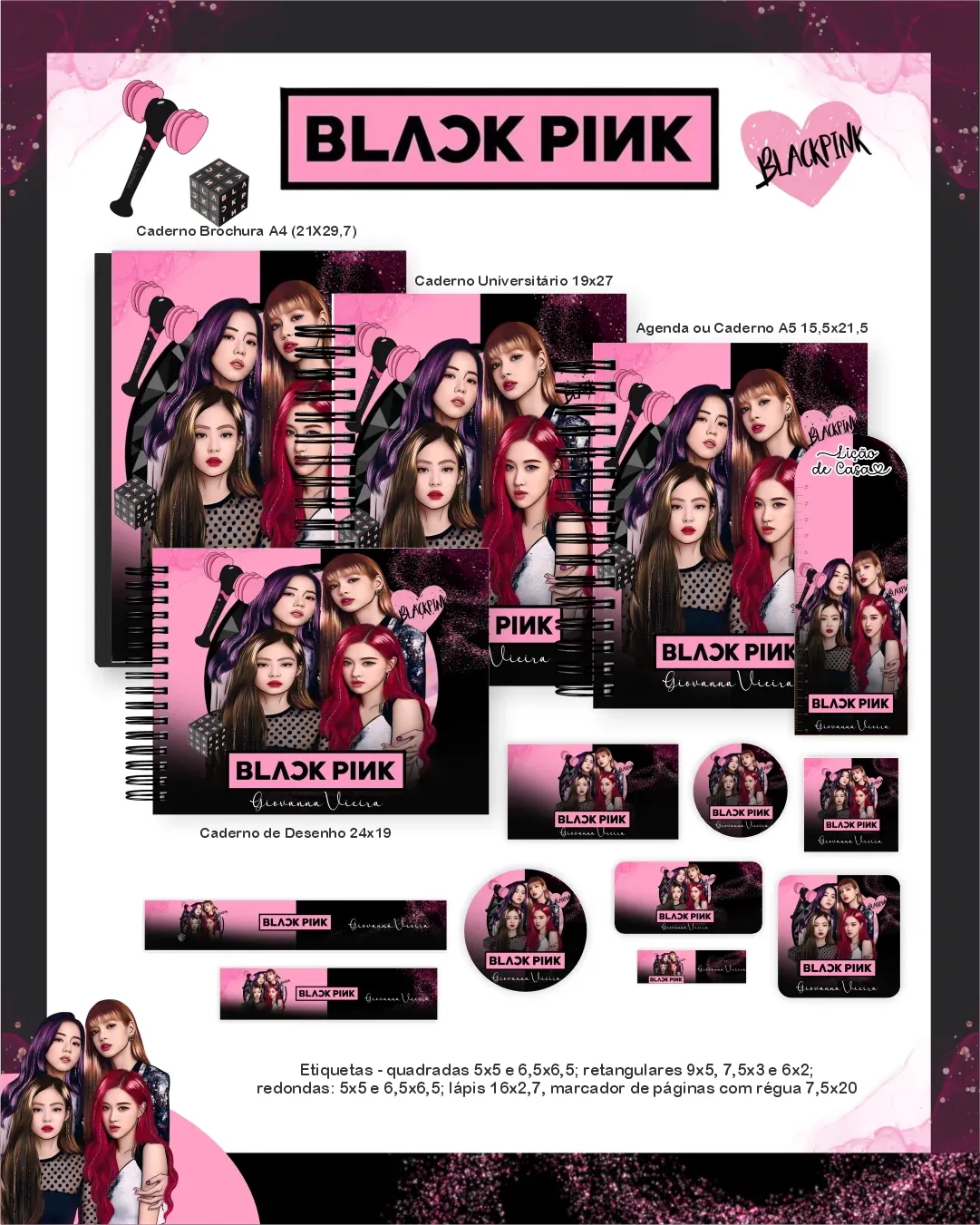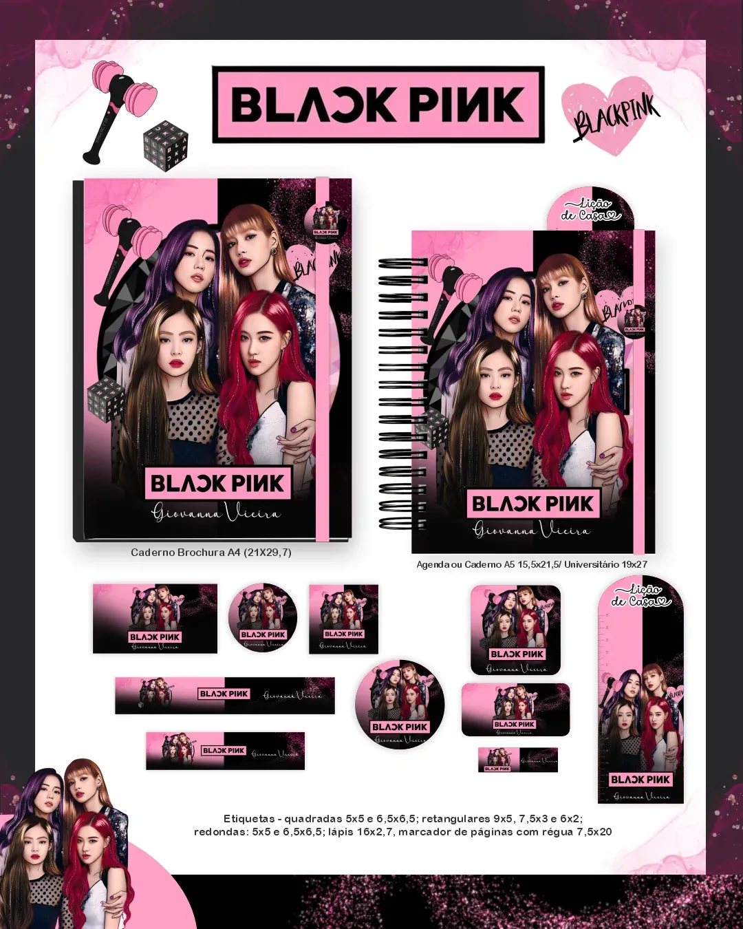 Explore o fenômeno do K-Pop com este pack exclusivo da Black Pink! Perfeito para a volta às aulas, traz artes modernas e vibrantes da famosa banda, capturando a essência do grupo para uma linha de produtos cheia de estilo e atitude.
